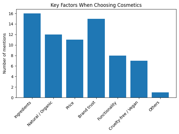 ほぼすべての回答に「Ingredients(成分)」「Brand trust(ブランドへの信頼)」いずれか、または両方が含まれており、インド市場において化粧品選択は感覚的・情緒的ではなく、理性的・判断型であることが分かる。