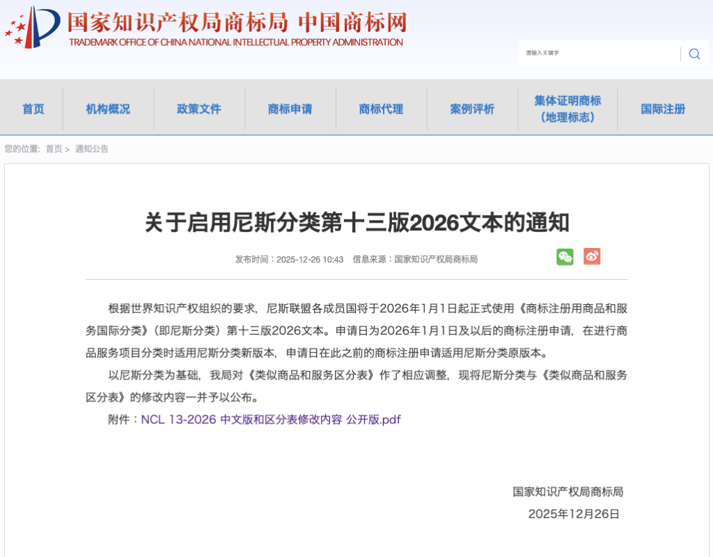 2025年12月26日、中国国家知的財産局商標局(略称:商標局)は、「『ニース分類第13版2026』の適用開始」に関する通知を公布しました。