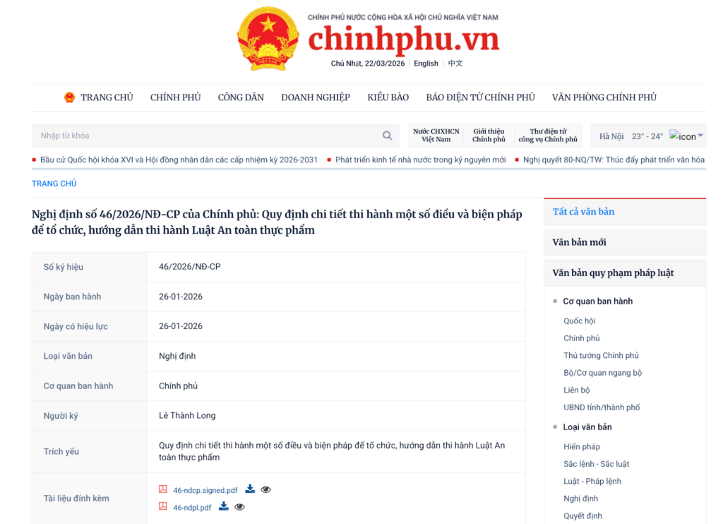 ベトナム議定46号「食品安全法の一部条項の施行細則および実施のための措置に関する規定」の主なポイント【2026年最新】