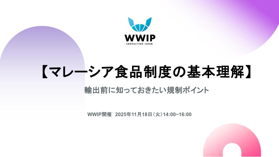 株式会社ワールドワイド・アイピー・コンサルティングジャパン (以下「WWIP」) は、2025年11月18日(火)14:00〜16:00に、「マレーシア食品制度の基本理解:輸出前に知っておきたい規制ポイント」を開催いたします。