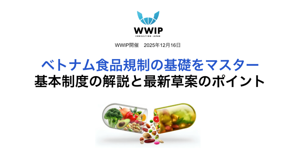 株式会社ワールドワイド・アイピー・コンサルティングジャパン (以下「WWIP」) は、2025年12月16日(火)14:00〜16:30に、「ベトナム食品規制の基礎をマスター:基本制度の解説と最新草案のポイント」を開催いたします。